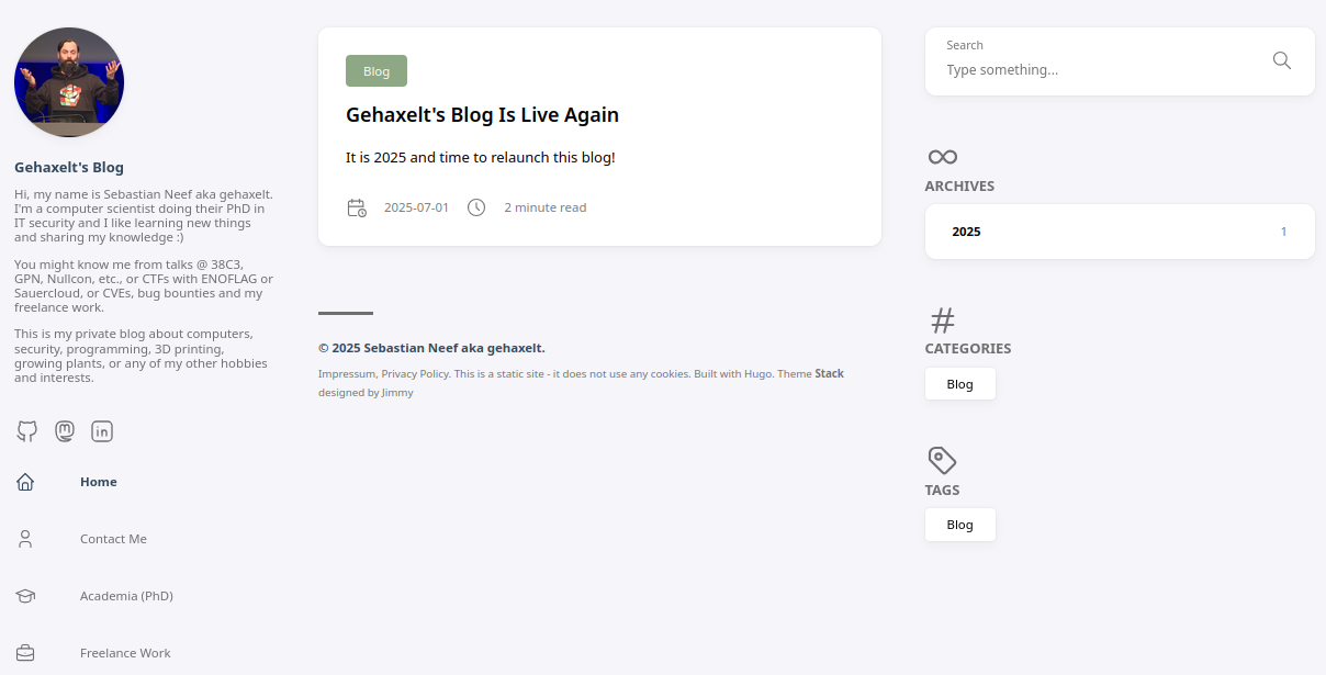 I decided to relaunch this blog in July 2025 with the goal to start blogging about my IT (security) projects and other related interesting topics (i.e., 3D printing, photography, etc.). View project